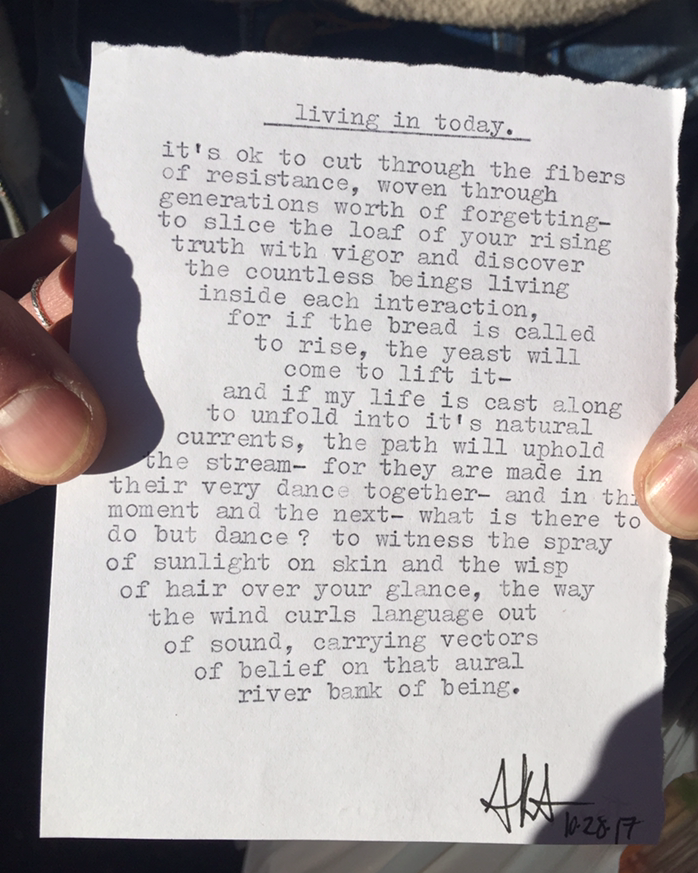 * Typically, on the street, patrons give $20 per poem, give or take. Typing the special request and then bringing it to the post office for mailing does require a little extra time on my part, so I like to ask folks to keep that in mind while making their contribution in exchange for a mail-to-order poem. If you would like to receive the poem framed, I can include this for an extra fee.