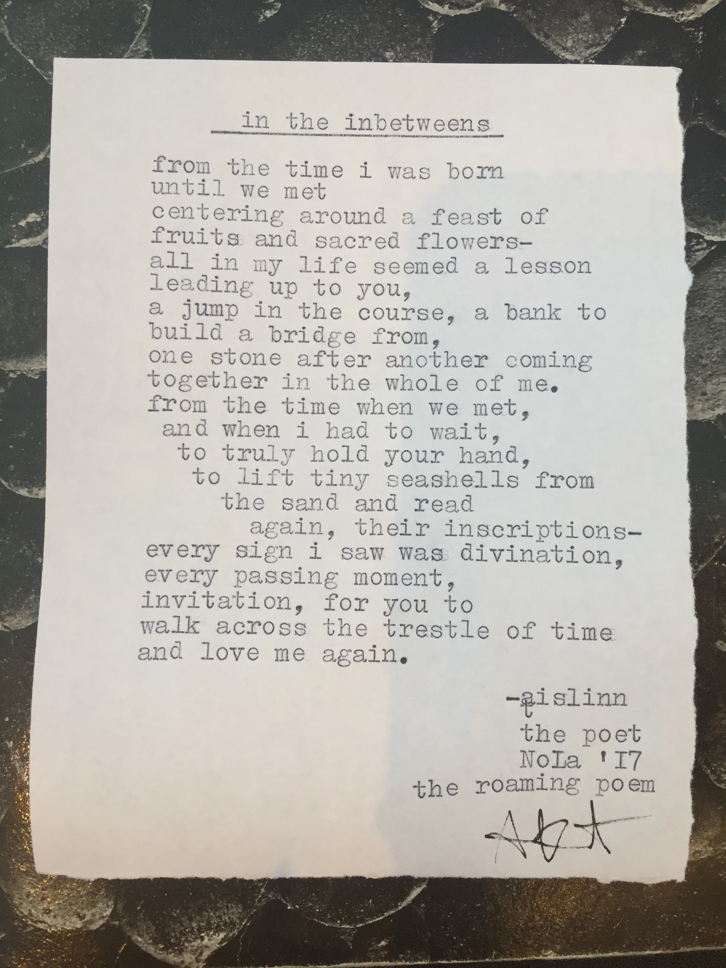 Ever consider having a poet for hire at your wedding or corporate event? I have several years of experience working large parties, where I can produce up to 50 poems (I usually stop counting…) in one evening. I also have read Tarot for several corporate events and parties while living in New Orleans. What fun! Email me for event and party rates.