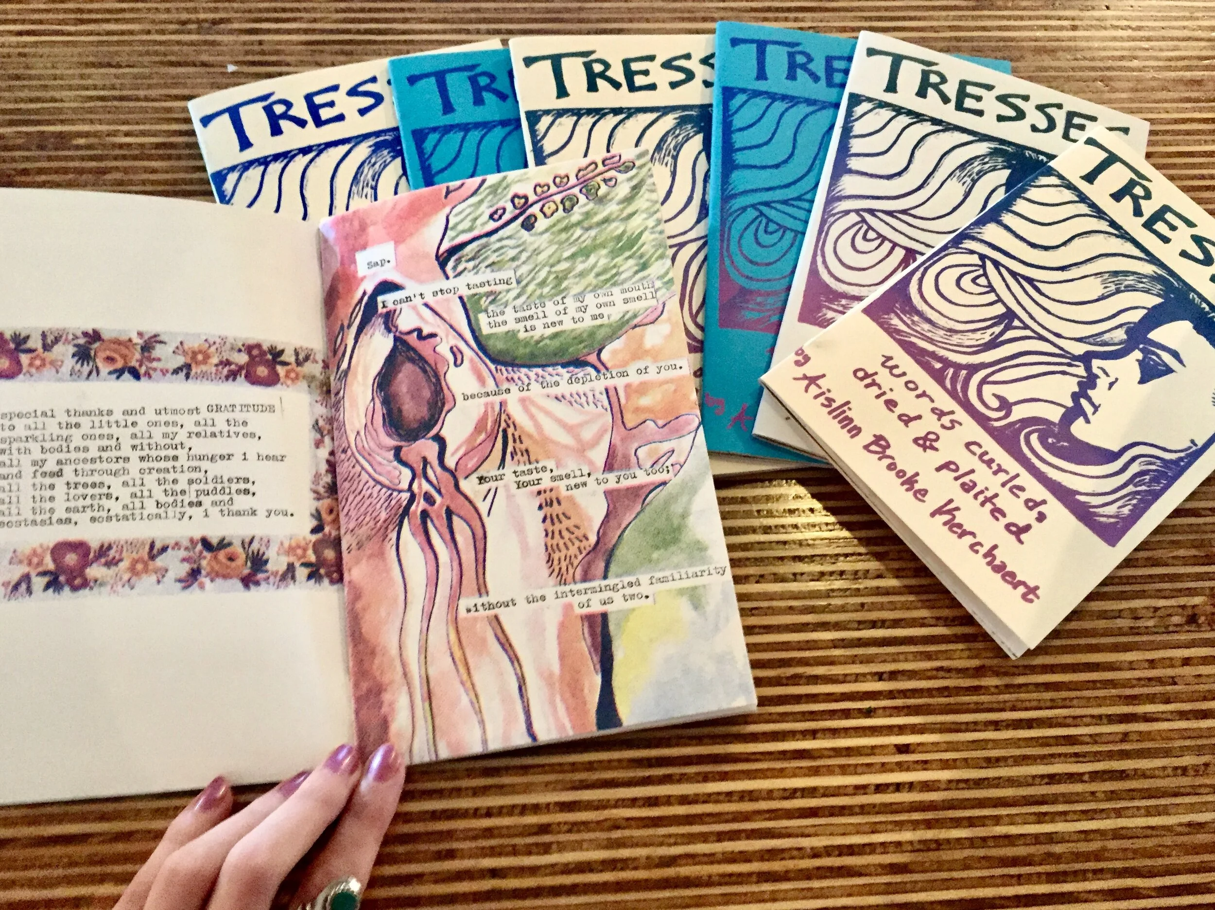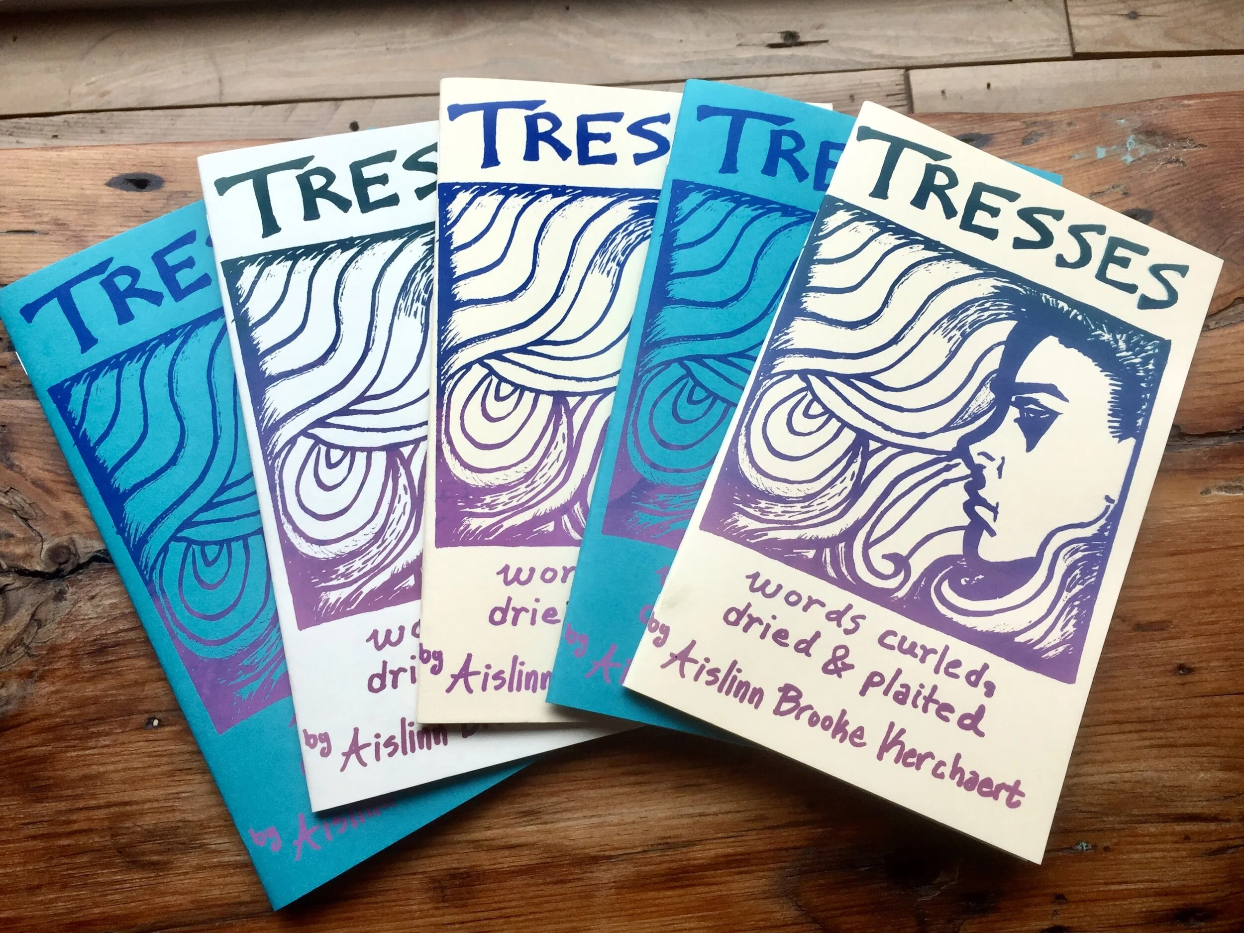 A zine is a small circulation, self-published work. Tresses: words curled dried & plaited features some of my earlier writings as a young poet. It is filled with art, illustration, collage and photos, along with original poems. This DIY Zine is Risograph printed, with a Silk Screen cover, making each book unique. The price is $20 and if you would like to order a copy please email aislinn@singswithtrees.com with your request.